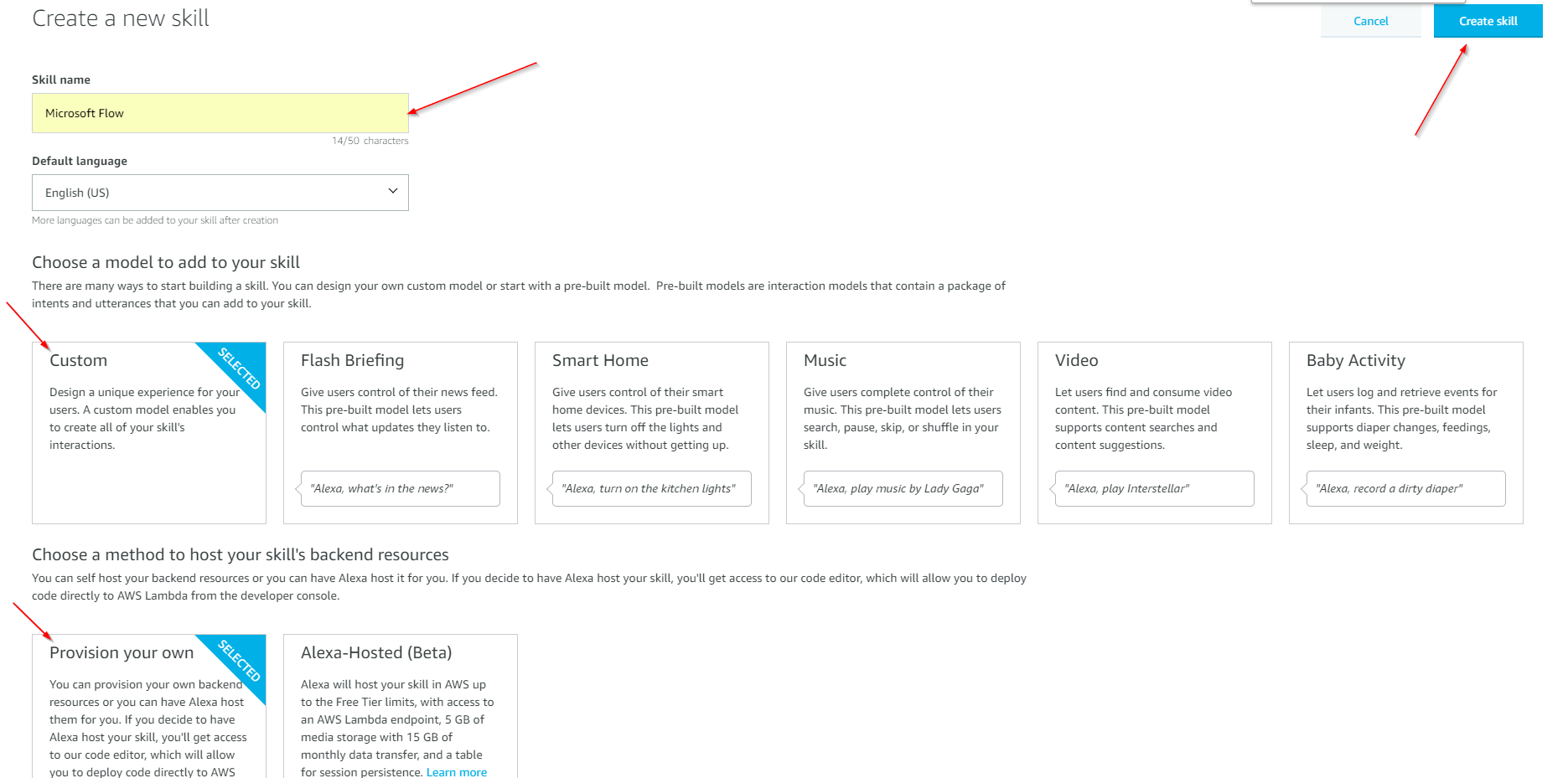 Enter a name for the skill , say “Microsoft Flow” and select the “Custom” model and “Provision your own” method for hosting the skill. Hit the “Create Skill” button.