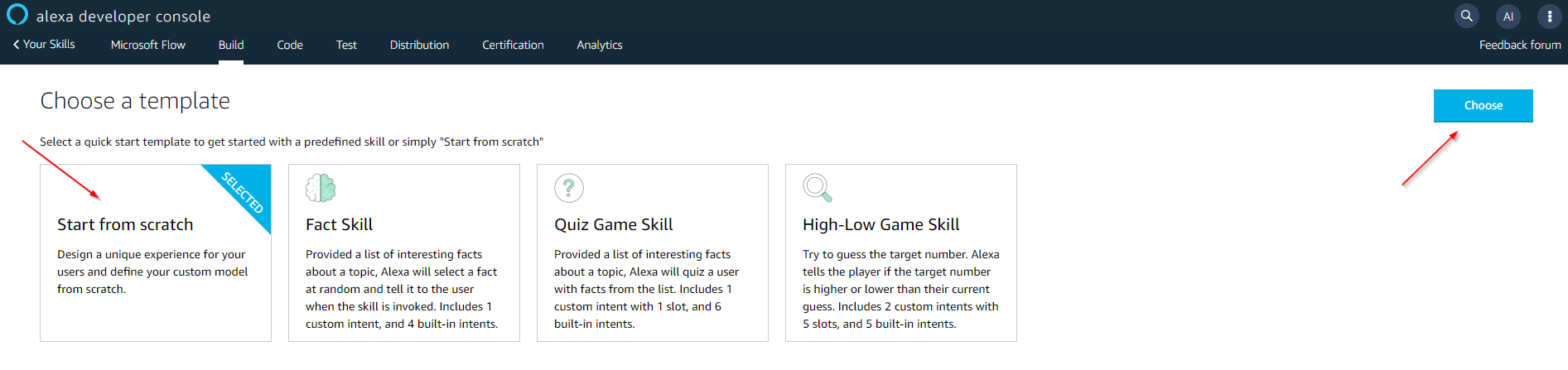 Choose the “Start from scratch” template and click on the “Choose” button. If you want to learn more about Alexa skills, you can choose the other templates to understand how they work.