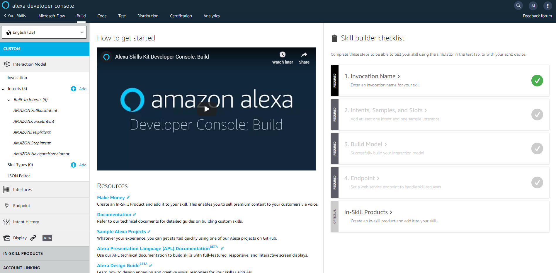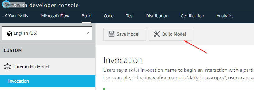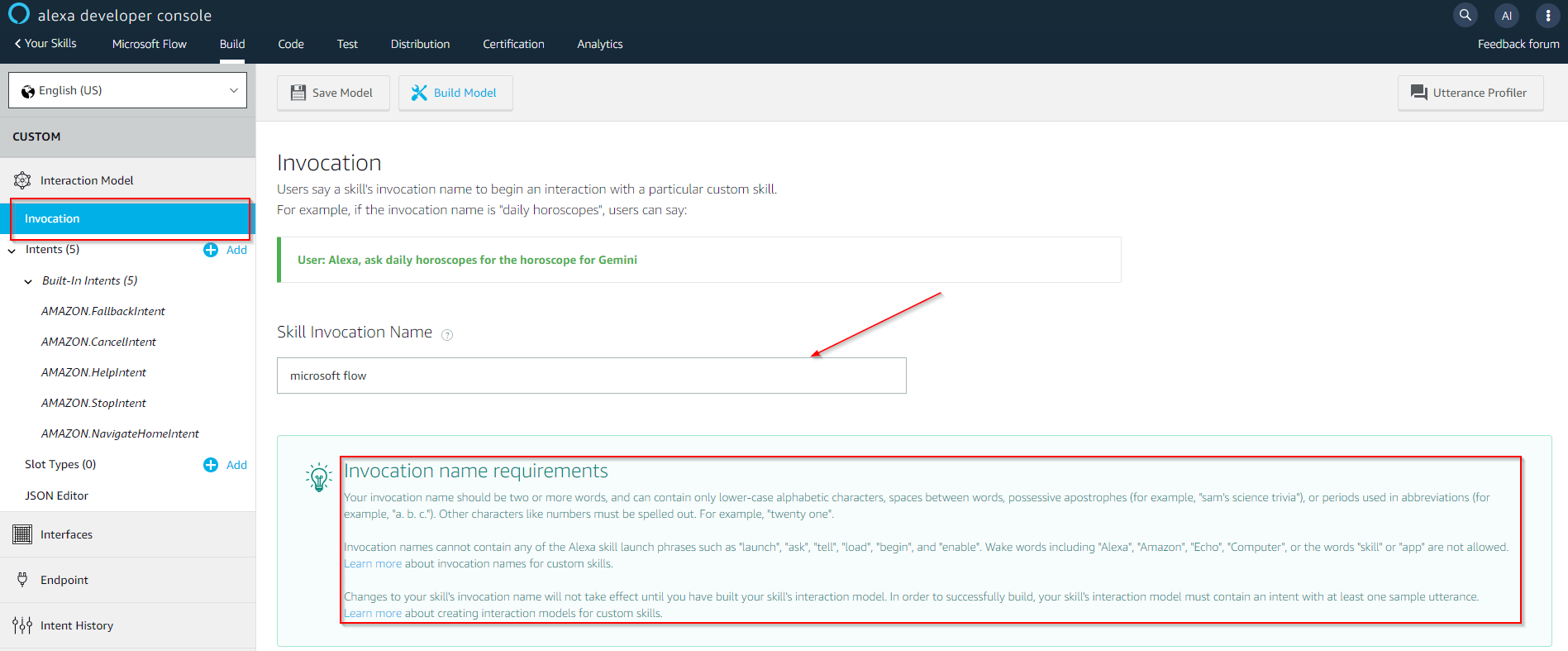 Let’s set the Invocation name first, which will be used to call the skill e.g. - “Alexa, ask Microsoft Flow to .. " . Note: this name can be different from the skill name.