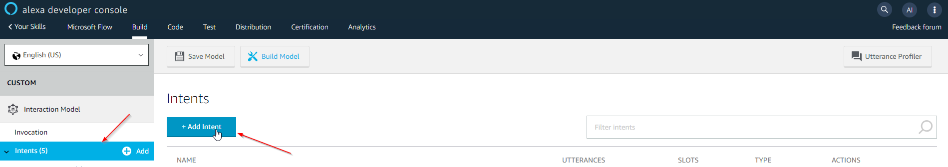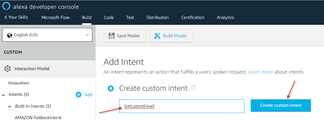 For this blog, I will trigger the Flow to get my last e-mail which will be then sent to Alexa that will read it out to me. So, let’s add an intent for this - “GetLatestEmail”. Click “Add Intent”, then enter the name of the intent and click “Create custom intent”
