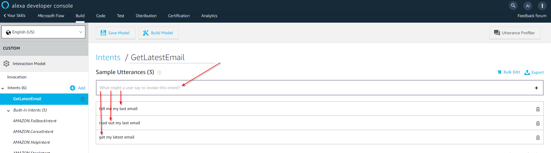 We need to enter some sample utterances that we willbuse to get the last email such as - “get my latest email”, “read out my last email”, “tell me my last email”. This will help Alexa know which intent you are trying to call. So, the complete expression that you will use -