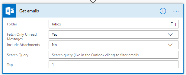 Add an action “Get Emails” (Outlook 365 Connector) to get the latest email. To get the last email, enter the value 1 in the ‘Top’ property.