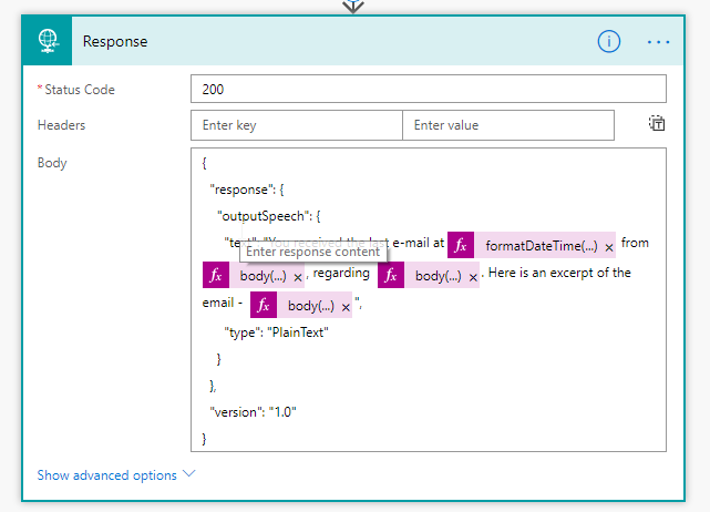 Hi Vivek, I tried your code. But when I use any of below function it is giving error while calling from alexa. @{formatDateTime(body(‘Get_emails’)[0][‘DateTimeReceived’],‘h m tt’)} @{body(‘Get_emails’)[0][‘From’]}, @{body(‘Get_emails’)[0][‘Subject’]} @{body(‘Get_emails’)[0][‘Body Preview’]} But normal text is giving result. I dont understand whats the problem. I am using Get Email V3 since they deprecated the old get mails. Your article really helped to test alexa. Thanks, Akash