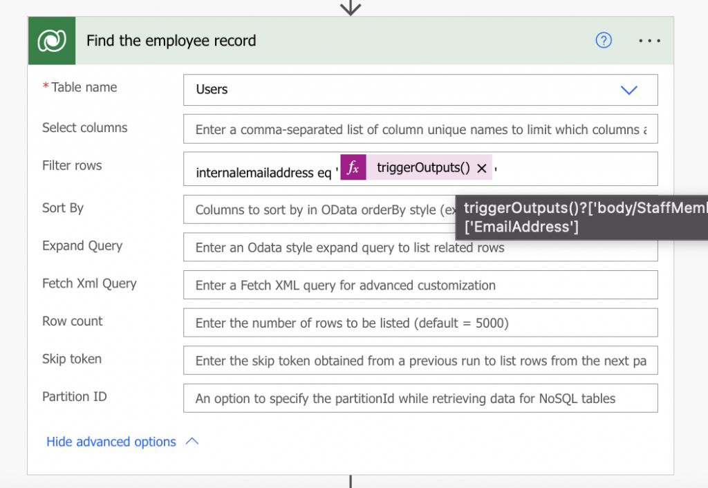 - Action 1: Find the employee and contact record in Dataverse from the email address