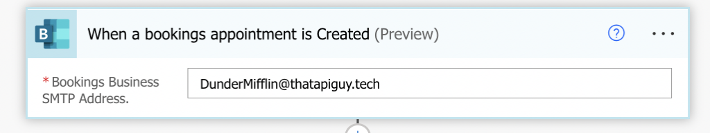 For the Bookings trigger, you will require the SMTP address of your Bookings page. To find this, just open your Bookings page and copy the email like address from the URL. In the below example, the SMTP address would be [email protected] .