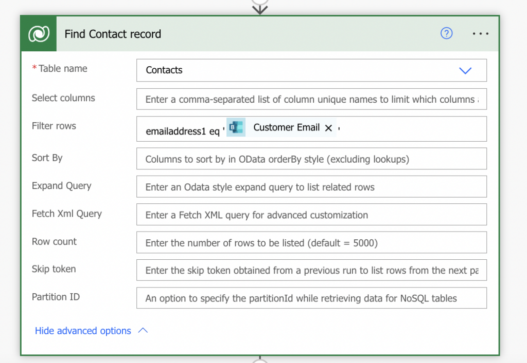 `emailaddress1 eq 'triggerOutputs()?['body/CustomerEmail']'`