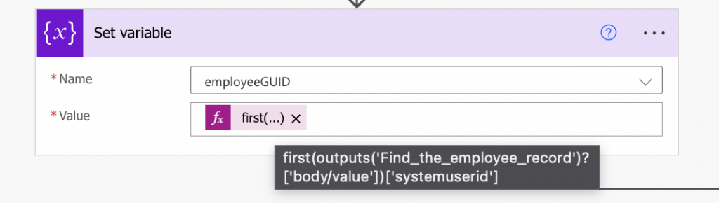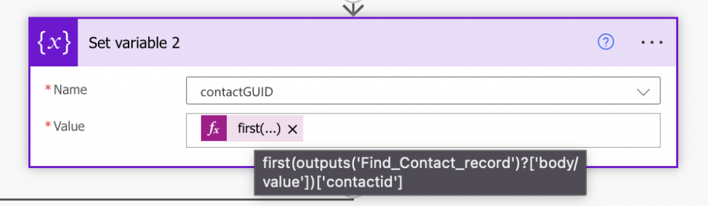Next, we will use the GUIDs from the first record returned in the above two actions and set them as variable values.