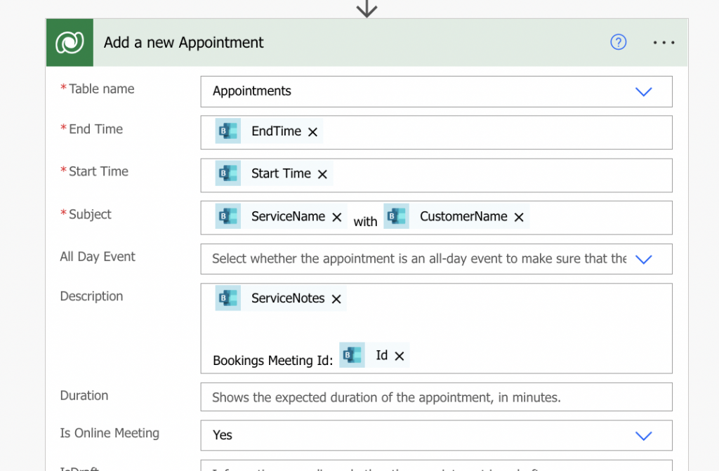 - Copy the Start Time and End Time from the Bookings appointment. For the Subject, you can get creative and compose it the way you prefer. In this example, we take the Service Name and combine that with the Customer Name. For the Description, use the Service Notes and insert the Bookings Meeting Unique Id, which you could then use to retrieve the Appointment in Dataverse if there is a change / cancellation of the Bookings Appointment. If you want the meeting to show up as a Teams meeting, make sure to select Yes for the “Is Online Meeting” column.