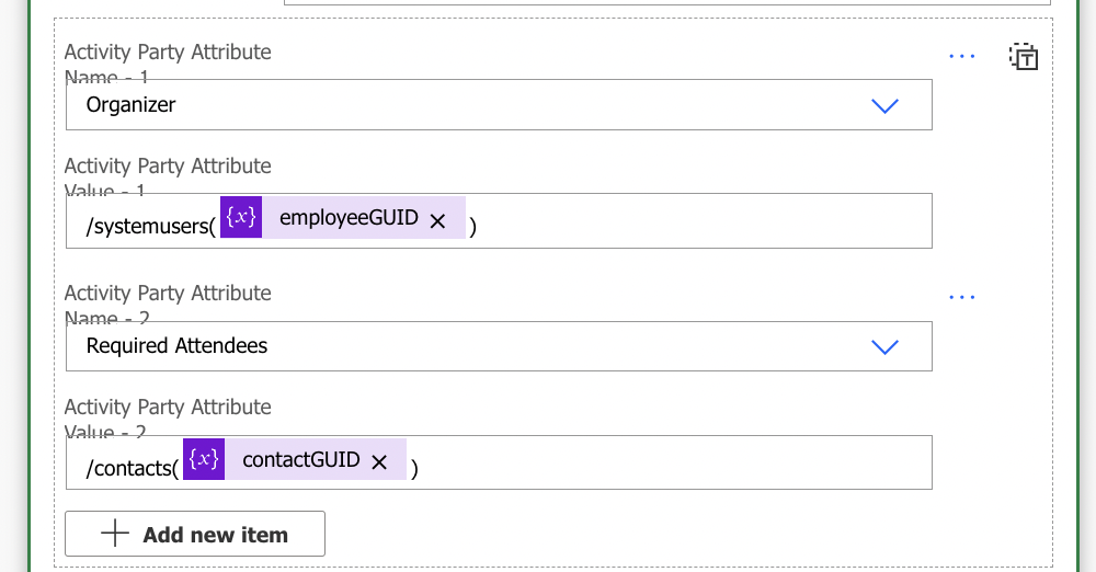 - Next, let’s define the organizer and the attendees which in the Dynamics/Dataverse world are known as Activity parties.