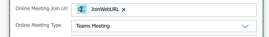 - Lastly, for the meeting to show up as a Teams meeting with the meeting link in Dataverse, we have to add a few more column values.