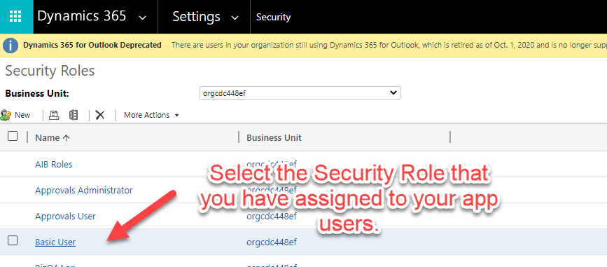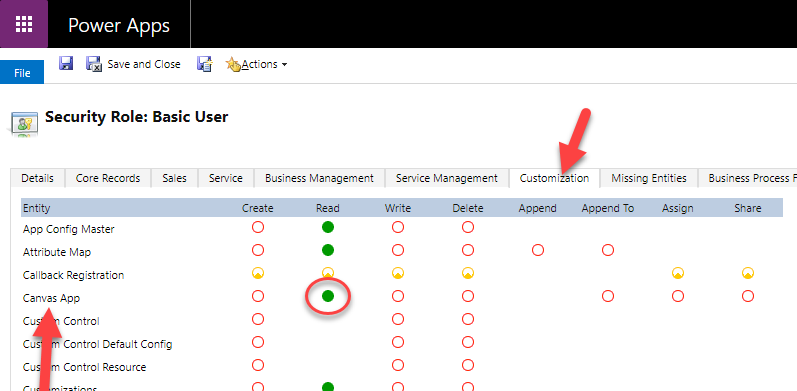 There is a Canvas App Entity/Table that the user needs ‘Read’ access to. To provide this access, navigate to