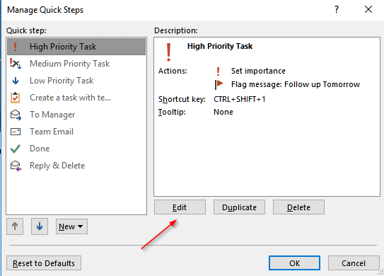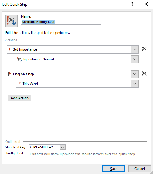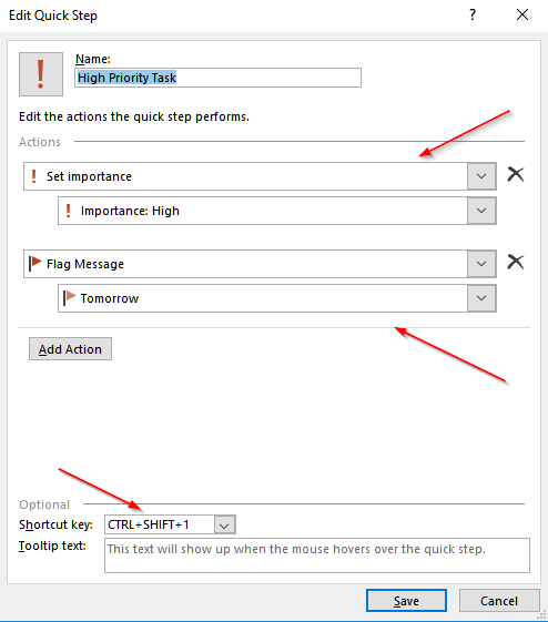 [caption id=“attachment_147” align=“aligncenter” width=“392”] Open Quick Steps in Microsoft Outlook.[/caption] [caption id=“attachment_146” align=“aligncenter” width=“543”] Click on ‘New’ or if you already have a configured quick step, click on ‘Edit’.[/caption] [caption id=“attachment_145” align=“aligncenter” width=“494”] Click on “Add Action” and choose “Set Importance” action and then select the Importance level from the drop down. Also, select the shortcut key so that you can assign the quick step from your keyboard.[/caption] [caption id=“attachment_144” align=“aligncenter” width=“493”] Similarly, set up similar shortcuts for the 3 different levels of Importance. Choose the shortcut keys wisely! For the High Importance I chose the “Ctrl+Shift+1”, for Medium Importance - “Ctrl+Shift+2” and for Low Importance - “Ctrl+Shift+3”.[/caption] So now you can use these shortcuts to quickly assign an importance level and flag the e-mails.