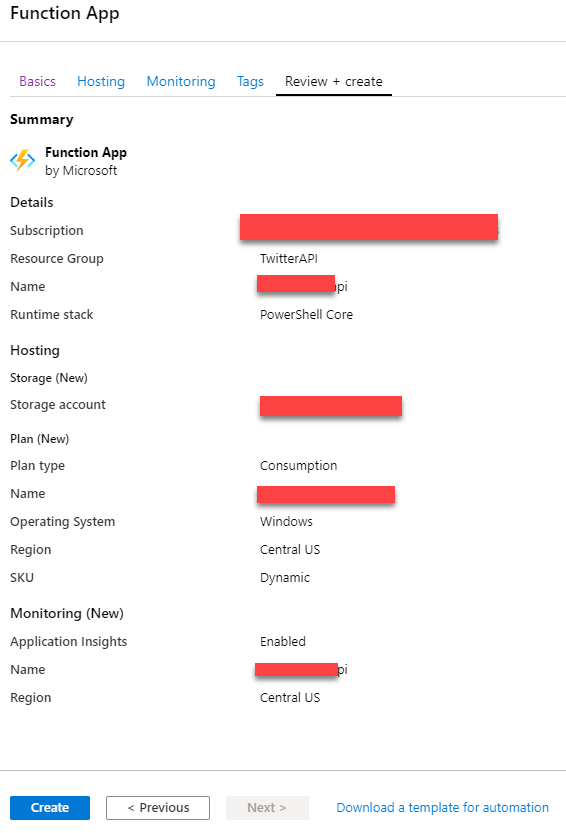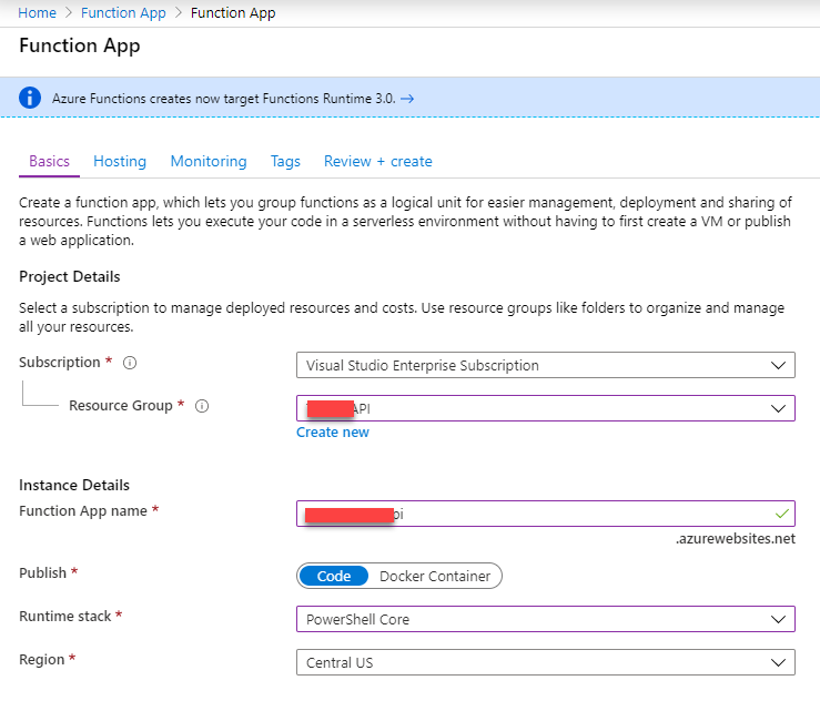 - Select the subscription (if you don’t have one, setup a “Pay as you go” subscription), select the resource group or create a new one , define a function app name and choose the runtime stack and region. Then click on ‘Review+create’. Once the data is validated, select create and wait for some time for the function app to be deployed.