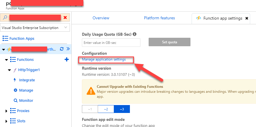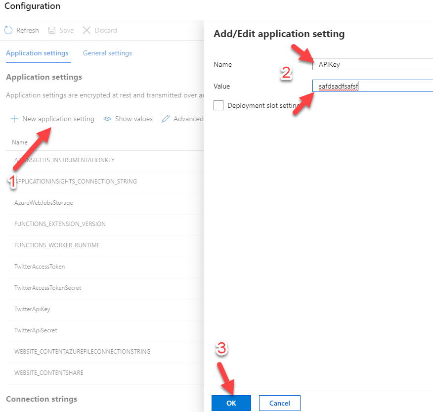 - Then go to the Application Settings of the function app and add the Twitter API keys and tokens there. I used these names - TwitterApiKey, TwitterApiSecret, TwitterAccessToken, TwitterAccessTokenSecret which I have referenced in the run.ps1 file (covered below)