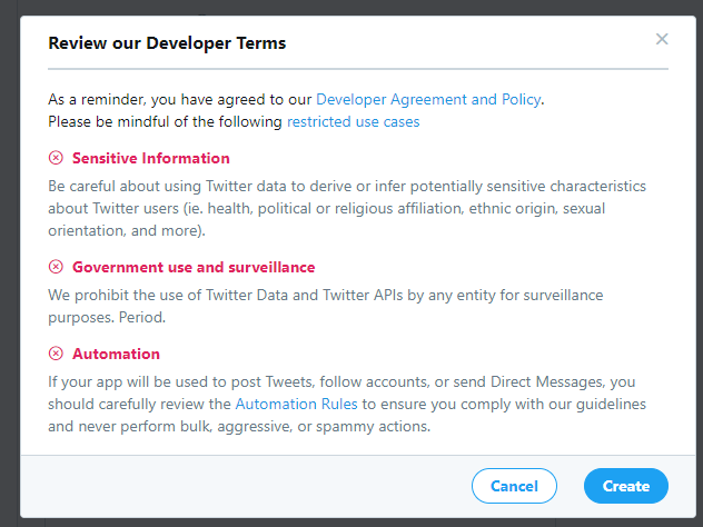 - Go to https://developer.twitter.com/en/apps and create a New App. If you don’t have a developer account, you can just create one for free.