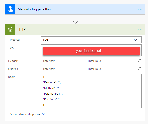 Add the “Manually trigger a flow” trigger and HTTP request as an action.