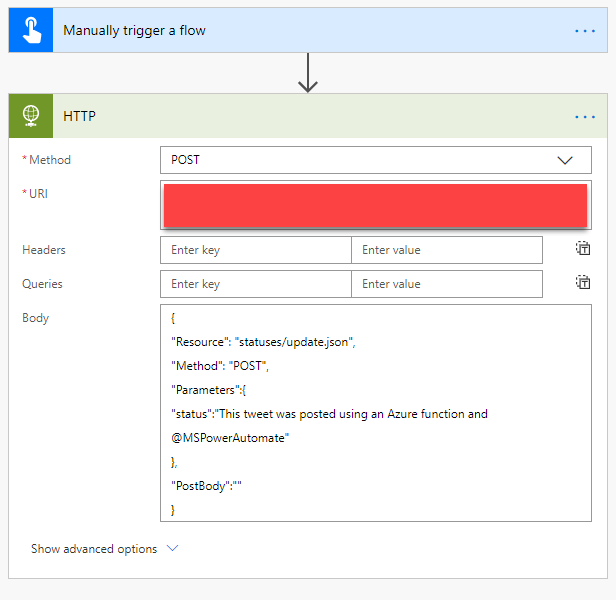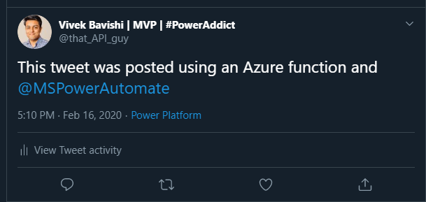 "status":"This tweet was posted using an Azure function and @MSPowerAutomate"