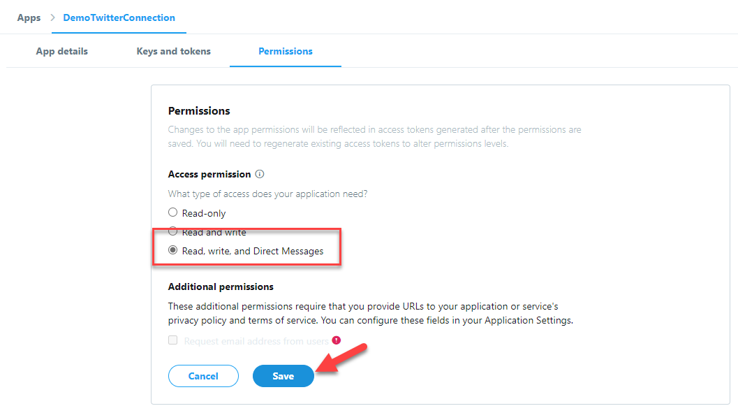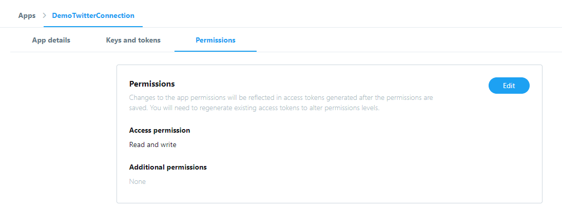 - Go the Permissions section , click on Edit and choose the “Read, write and Direct Messages” option and hit save.