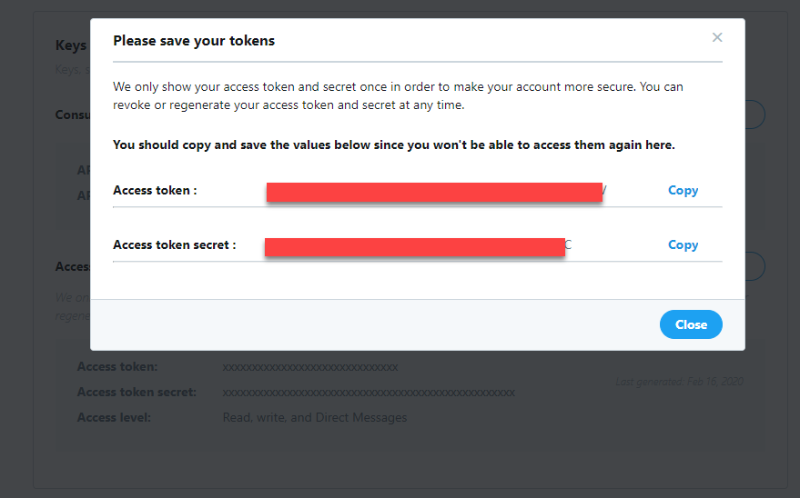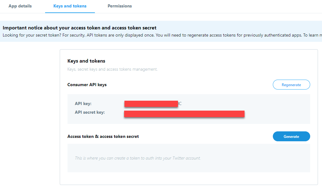 4. Go to the “Keys and Tokens” section and click on generate to get the access token and access token secret. Copy them and save it securely. Also copy the API Key and API secret key.