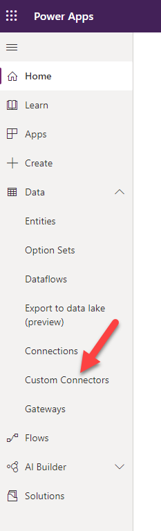 First, go to either make.powerapps.com or flow.microsoft.com and log in with your credentials. Click on custom connectors in the left navigation menu.