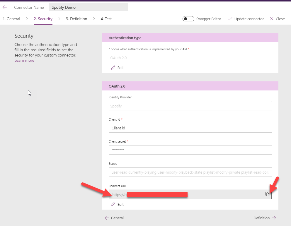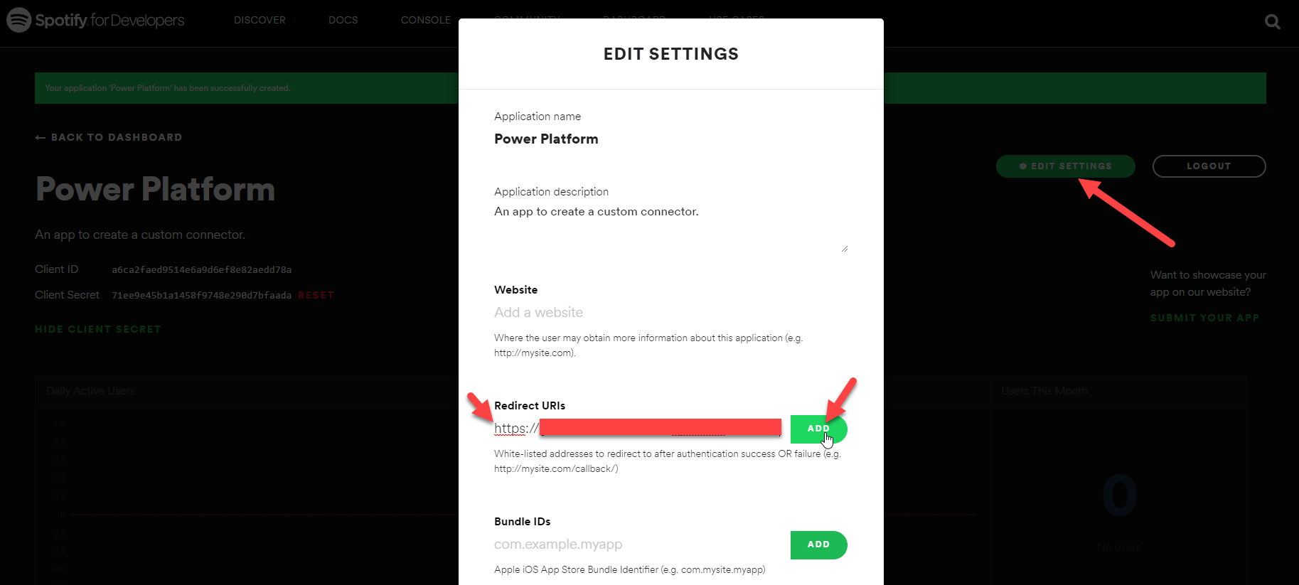 Click on create connector. You will now see that the redirect URL has been created. Copy it and paste it on your Spotify app’s settings and save it.