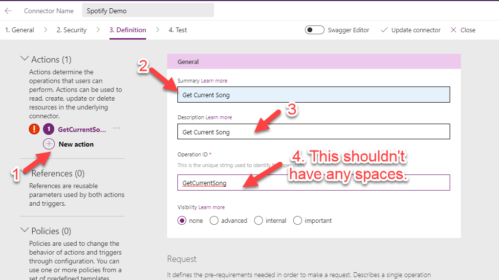 For the Definition step, let’s create an action to get the current song playing on Spotify. We will try some other API endpoints at a later stage.