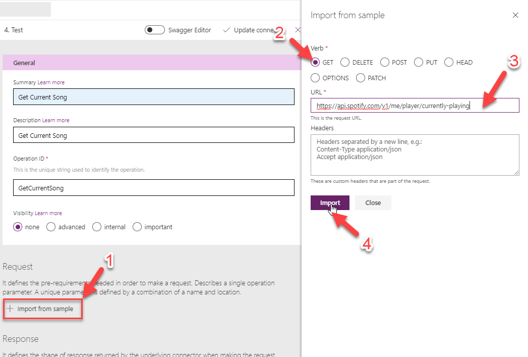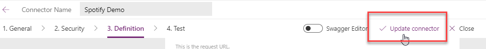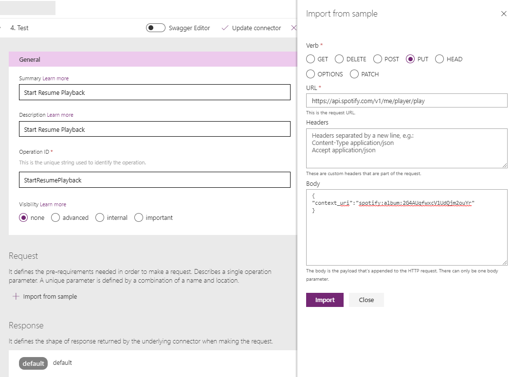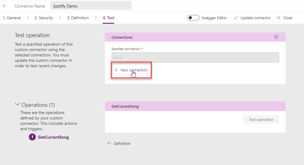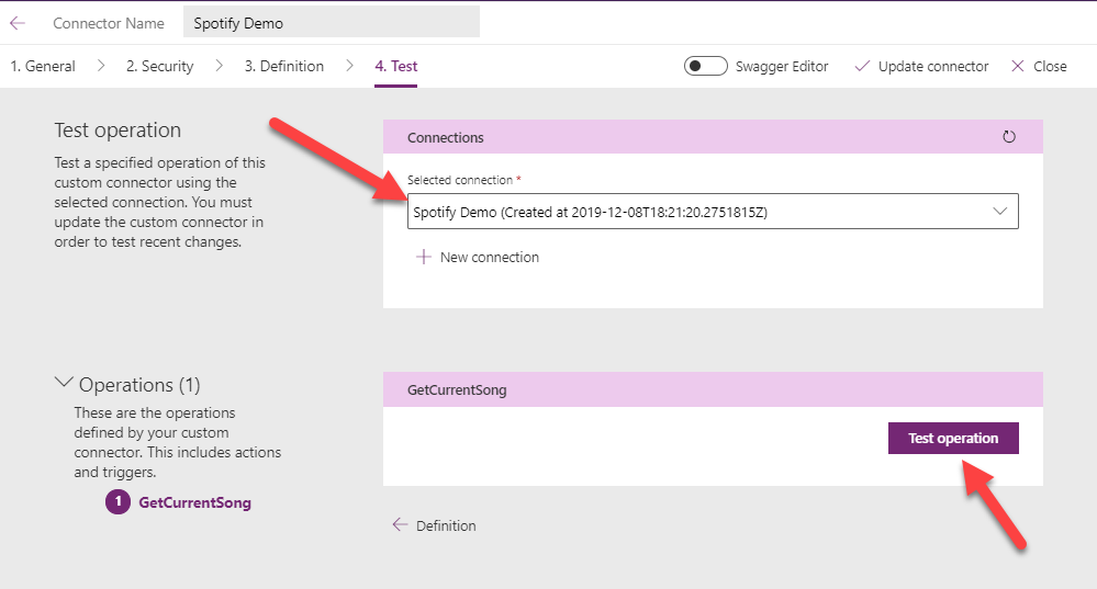Now, go back to Custom connectors page and click on edit, and go to the ‘Test’ section. You will now see the connection that you just created in the Connections drop-down list. All that is left to do is to click on ‘Test Operation"! Before you do that, play a song on your Spotify.